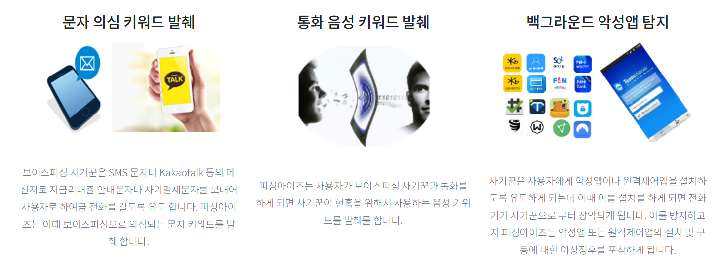한국형 자연어 분석 기술을 이용해 통화 중 보이스피싱 가능성이 있는 대화 내용을 감지하고 경고합니다.
