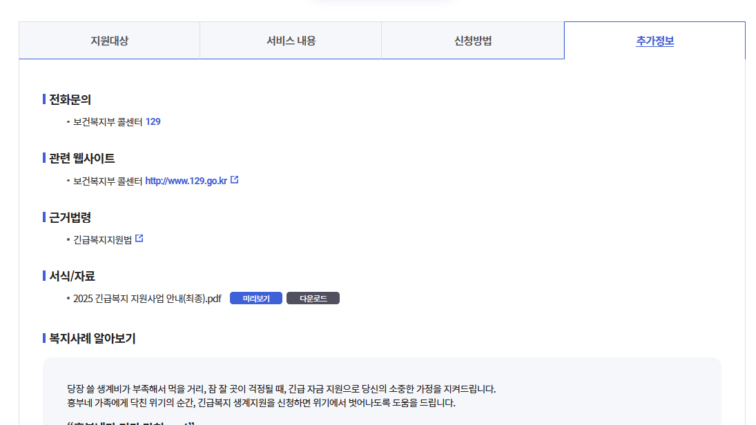 정부는 2025년 긴급복지 예산을 대폭 확대하여 보다 많은 국민이 빠르고 실질적인 도움을 받을 수 있도록 하고 있으니, 아래의 공식 채널을 통해 정확한 정보를 확인하시고 빠르게 신청하시길 권장드립니다.