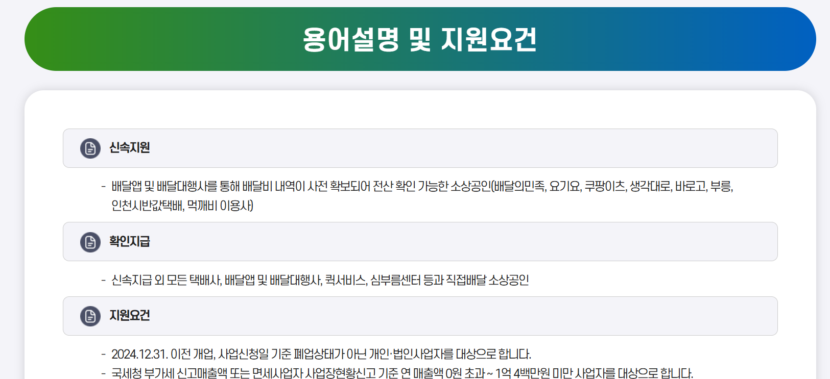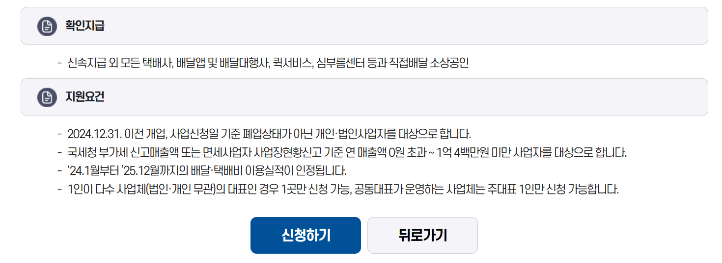 신청 시 허위 자료를 제출하거나 자격요건을 갖추지 않은 경우, 지원금 환수 또는 향후 정부지원 사업 참여에 제한이 있을 수 있습니다. 따라서 반드시 실제로 발생한 배달·택배 관련 비용에 대해 증빙자료를 구비해 신청해야 하며, 사업자등록증 등 기본 서류도 함께 제출하는 것이 바람직합니다.