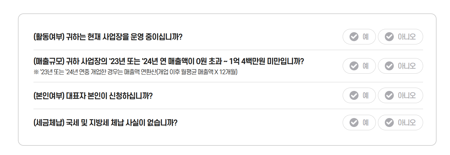 또한, 연 매출 기준은 국세청 신고자료를 기반으로 판단되기 때문에, 최근 2개년도(2023, 2024년)의 정확한 매출이 기준 이하인지 확인하고 신청하는 것이 중요합니다.