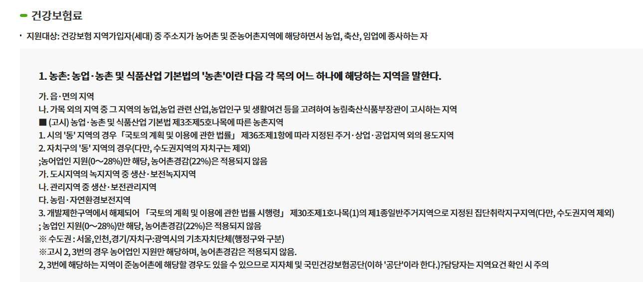 일정 요건을 충족하는 농업인을 대상으로 건강보험료를 감경해주는 제도를 운영하고 있습니다.