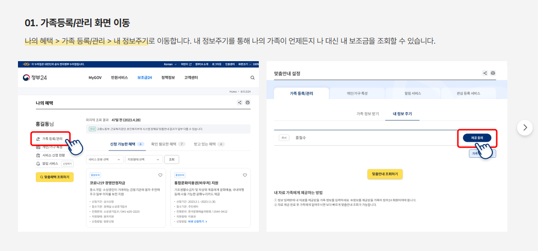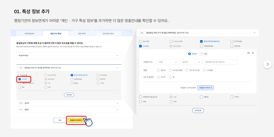 현재 보조금24는 본인에 대한 혜택만 조회할 수 있습니다. 다만, 가족구성원에 따라 받을 수 있는 복합 혜택은 자동으로 추천됩니다.