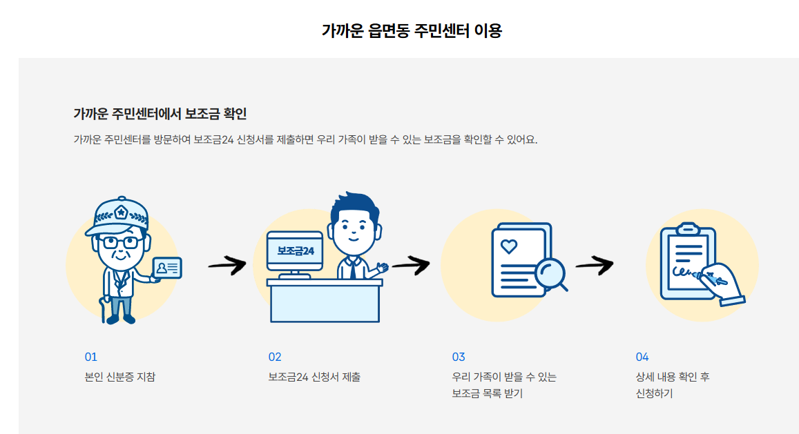 만약 온라인 신청이 불가능하다면, 어디로 가야 하는지, 준비해야 할 서류는 무엇인지까지 상세히 안내해줍니다. 이를 참고하여 주민센터, 관공서 등 방문하여 신청하면 됩니다.