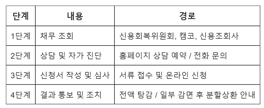 | 4단계 | 결과 통보 및 조치 | 전액 탕감 / 일부 감면 후 분할상환 안내 |