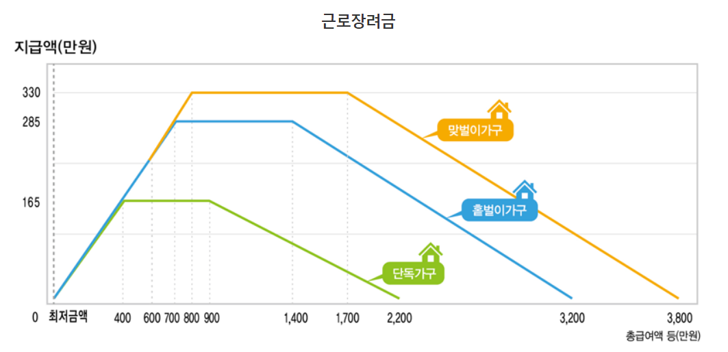 ex) 단독가구인 경우 총급여액 등이 900만원이라면 최대액인 165만원을 받지만, 그 이상으로 늘어나면 지급급액이 조금씩 줄어듭니다.