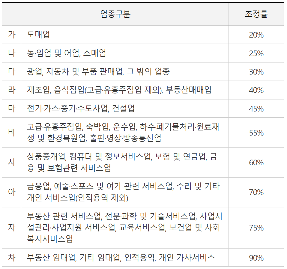 - 여기서 사업소득은 벌어들인 돈 모두를 더하는 것이 아니라 사업수익금액에 업종별 조정률을 곱하여 계산합니다.