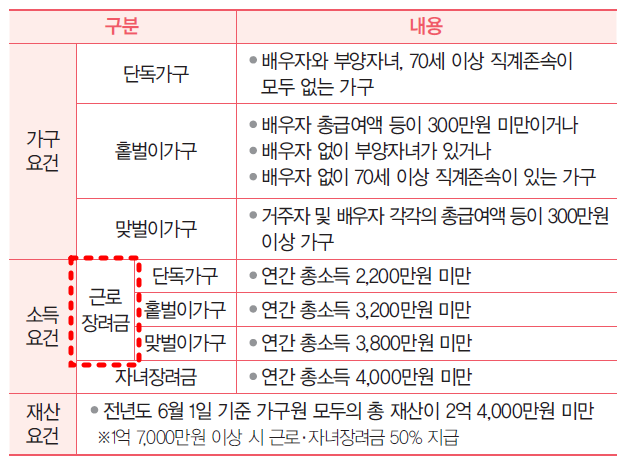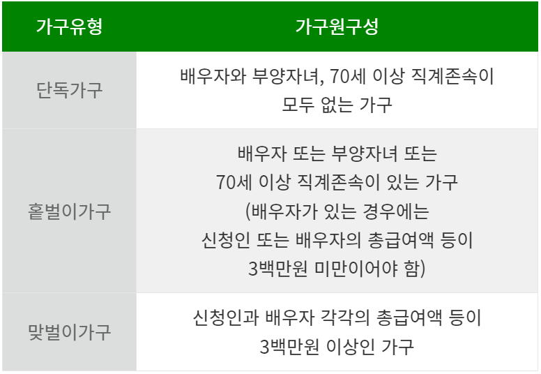 ✔ 홑벌이가구: 배우자 또는 부양자녀 또는 70세 이상 직계존속이 있는 가구 중 신청자 또는 배우자의 소득이 300만원 미만인 가구
