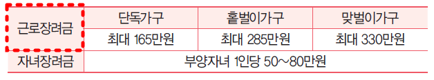 올해로 들어 근로장려금최대 지급액이 상향 조정되었습니다. 단독가구의 경우 종전 150만 원에서 165만 원까지, 홑벌이 가구는 260만 원에서 285만 원으로, 맞벌이 가구는 300만 원에서 330만 원으로 지급액이 늘어났습니다.