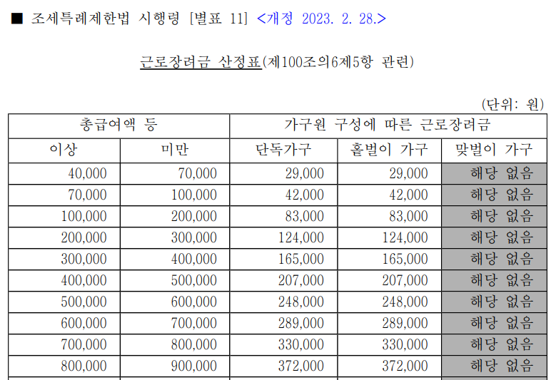 근로장려금 산정표(테이블)