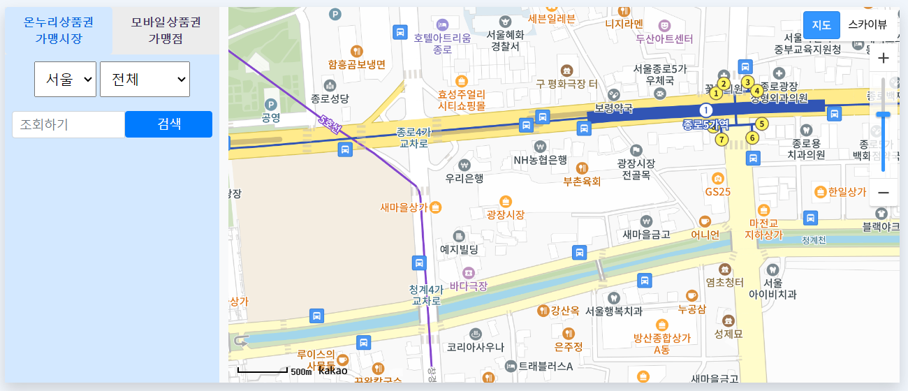 조회는 시/도, 군/구 또는 시장명, 점포명 등을 입력하는 방식인데요, 또는 지도로 찾을 수 있는 등 다양하게 찾아볼 수 있습니다.
