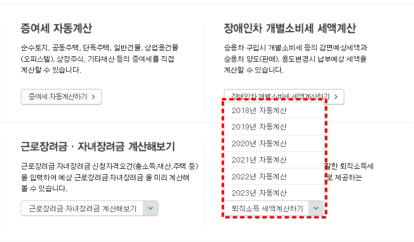 국세청 홈텍스 홈페이지 접속 후 → 오른쪽 메뉴 중 '모의계산' → 퇴직소득 세액계산 클릭