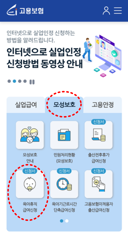 - '모성보호' 메뉴에서 '육아휴직 급여신청' 을 눌러줍니다.