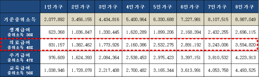 중위소득의 40% 이하면 의료급여 기초생활수급자 대상이 됩니다. 마찬가지로 가구원 수에 따라 다릅니다.