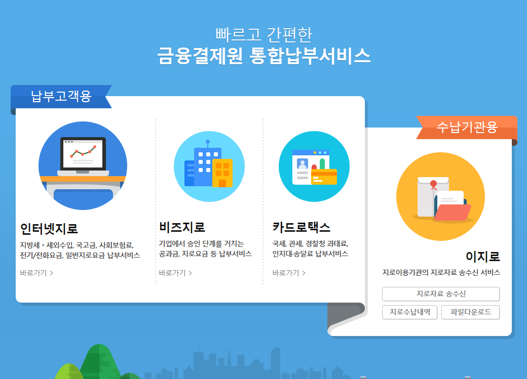 1. 인터넷납부 : 🔗인터넷지로(giro.or.kr), 위택스(wetax.go.kr), 또는 각 은행 홈페이지의 공과금 메뉴