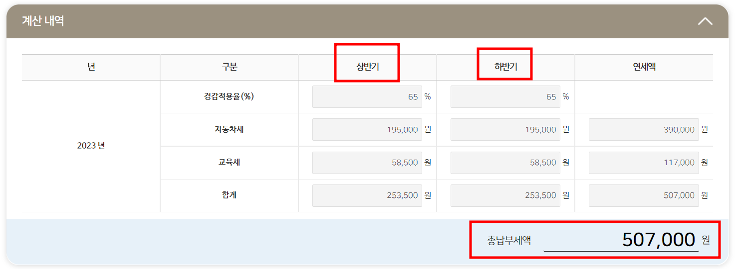 - 내가 입력한 사항에 따라 계산내역이 출력이 됩니다. 이 금액이 내가 1연간 낼 총 차동차세 입니다. 상반기 하반기 낼 금액은 각각 총액의 50%입니다.