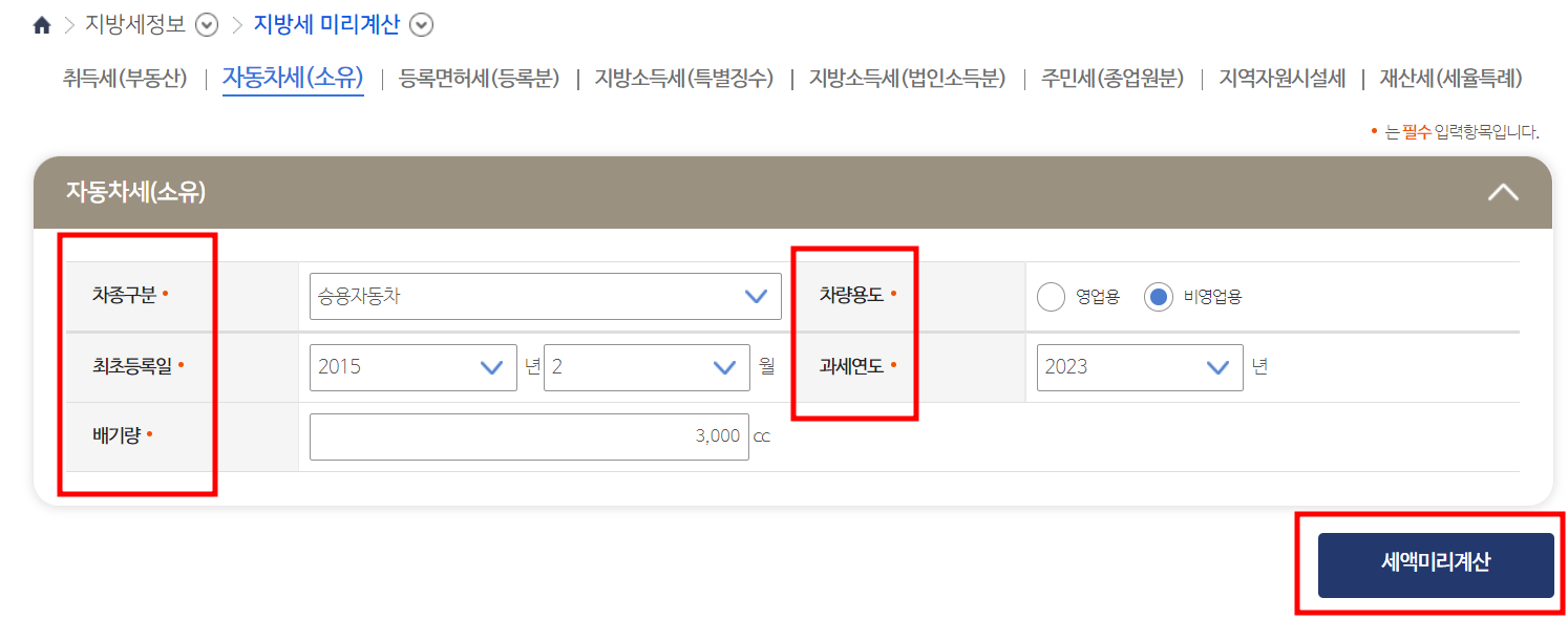 - 차종구분, 최초등록일, 배기량, 차량용도, 과세연도를 정하고 세액미리계산 버튼을 누릅니다.