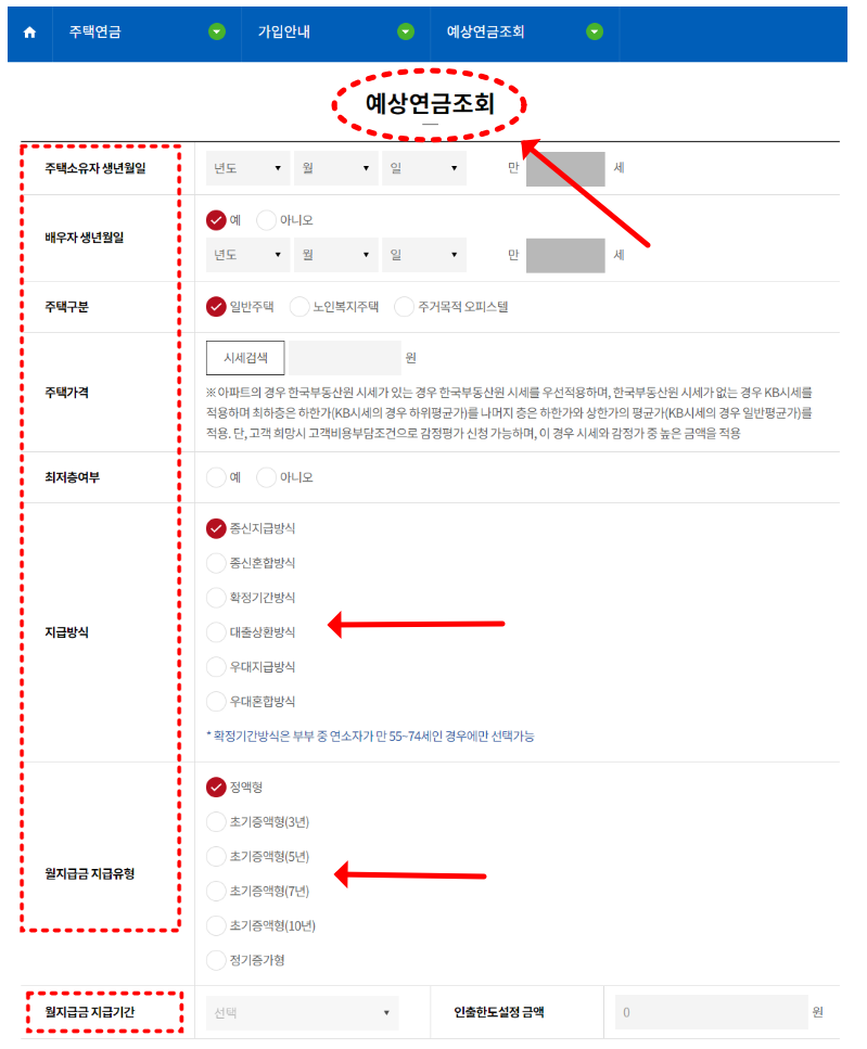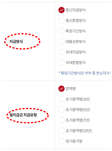 우대지급, 우대혼합 선택 조건은 부부 중 1인이 기초연금 수급자이거나 부부 모두 보유한 주택이 기준 시가 2억원 미만 1주택이면 선택 가능합니다.