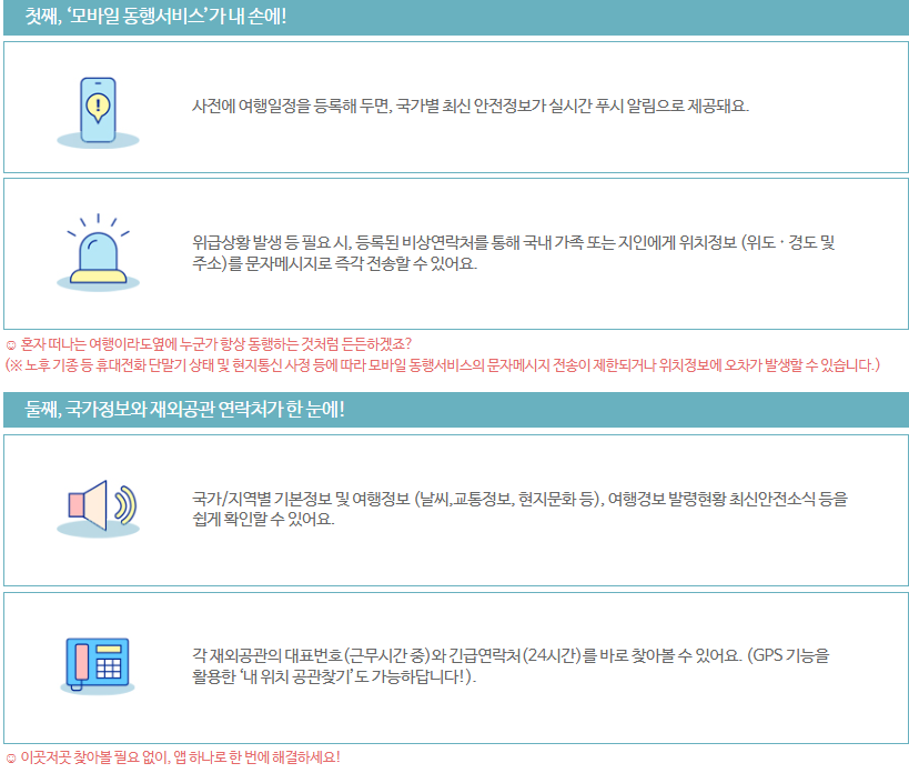 외교부 안전여행 사이트에서는 공식 앱 설치를 권하고 있으며 앱을 통해 재난정보, 대사관 위치와 연락처, 각종 긴급 알람을 보내고 있으니 꼭 설치하시기를 권합니다.