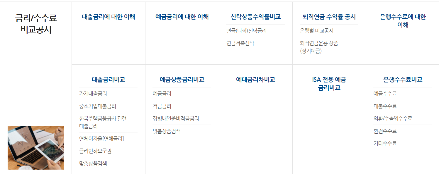 전국은행연합회 홈페이지를 들어가시면 금융상품 정보에서부터 금리/수수료 비교까지 다양한 기능을 보실 수 있습니다.