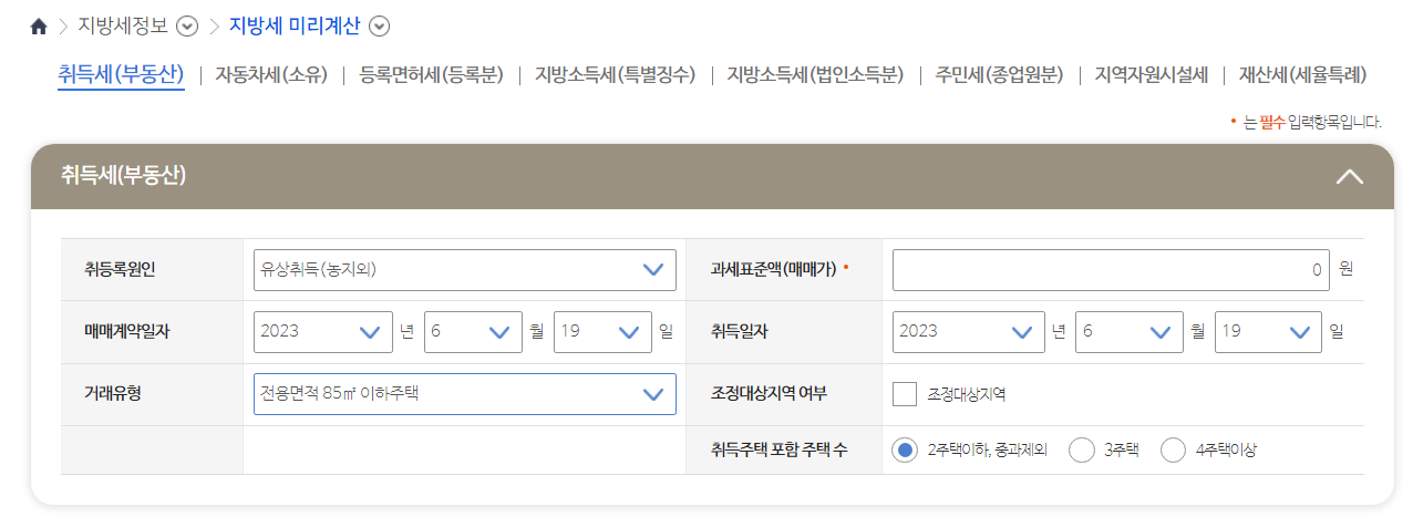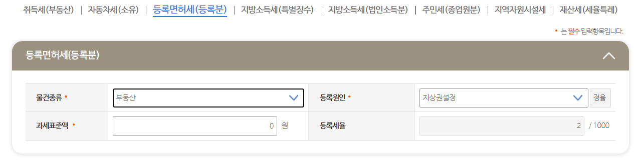 취득세, 등록면허세(등록세) 모두 계산할 수 있으며 기타 다른 계산도 가능하므로 알아두시면 편리합니다.