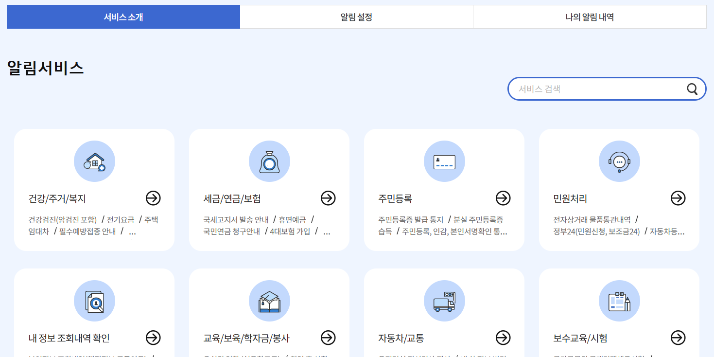정부에서 제공하는 국민 맞춤형 알림 서비스예요. 매년 잊지 않고 해야 하는 건강검진, 자동차 검사, 세금 납부 같은 중요한 정보들을 미리 알려주니까 정말 유용하므로 구삐 알림서비스를 신청하세요.