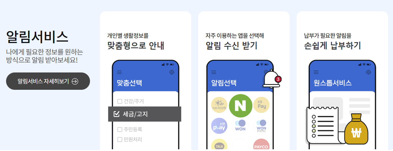 그리고 또 한 가지, 세금 납부 알림이 정말 유용했어요. 평소에는 세금 납부 기간이 다가오면 집으로 우편물이 오잖아요. 그런데 요즘은 집으로 오는 우편물들을 잘 챙기지 못할 때가 많더라고요. 구삐 알림서비스 덕분에 놓치지 않고 제때 세금을 납부할 수 있었어요. 아마 이 서비스가 없었다면 깜빡하고 연체료를 내게 되는 상황이 발생했을지도 몰라요.