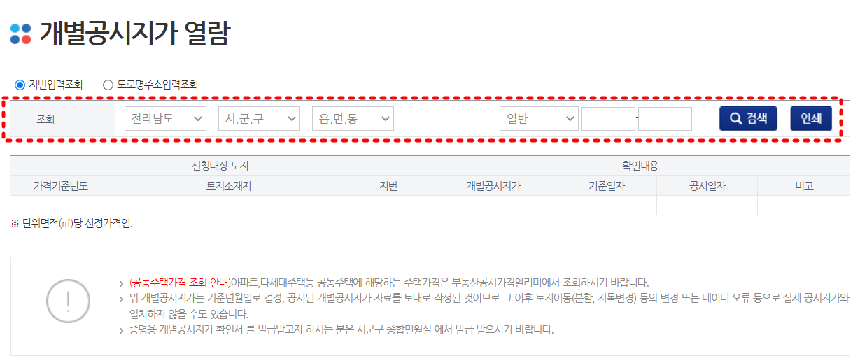 그러면 해당 지역의 사이트에 있는 개별공시지가 조회로 연결되는데요, 원하는 곳 입력 후 검색을 눌러줍니다.