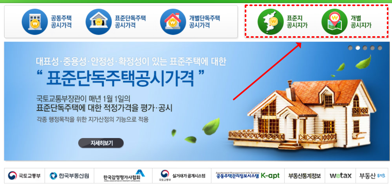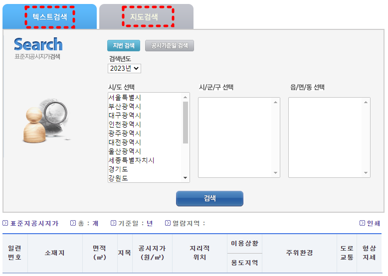 공시지가 조회 사이트로 접속하면 표준 공시지가와 개별 공시지가 조회가 가능합니다.