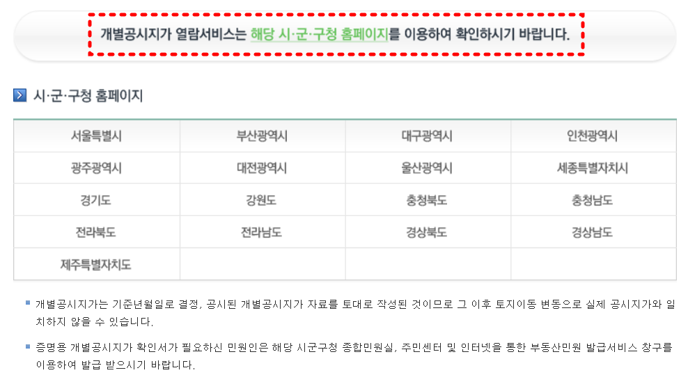 개별 공시지가 조회 메뉴로 들어가면 시군구청 홈페이지로 연결되는 사이트가 나옵니다.