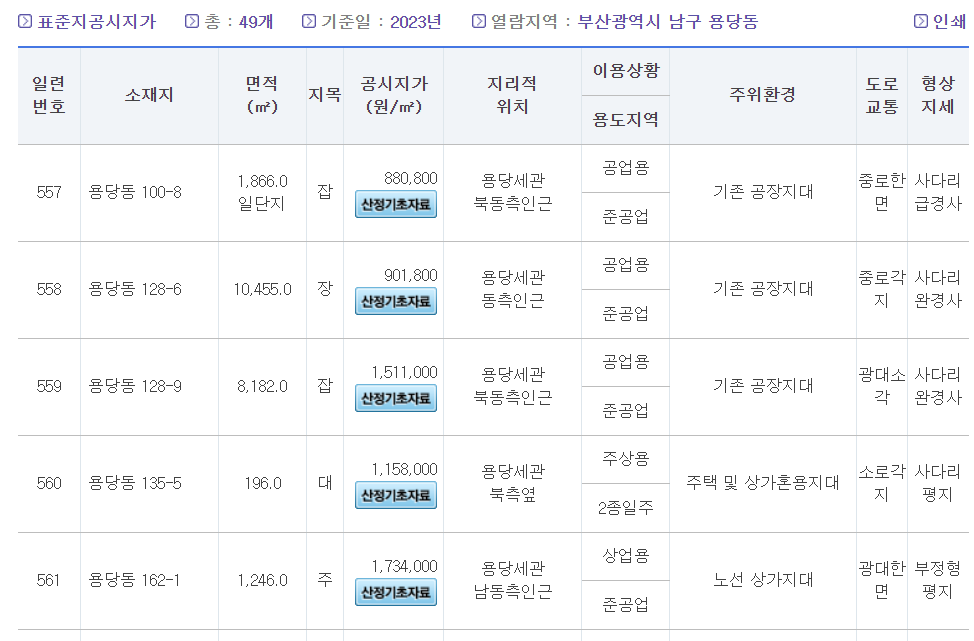 표준 공시지가의 면적과 공시지가, 위치, 이용상황 등을 확인할 수 있습니다.