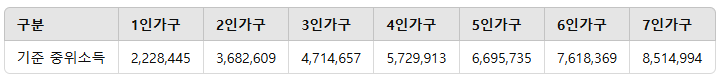 8인 이상 가구의 경우 7인 가구의 중위소득에서 6인 가구 중위소득의 차이를 더하여 계산합니다.