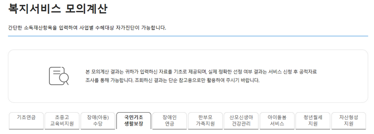 계산이 어려우므로 복지로에서 '기초생활수급자 모의계산기'를 이용하시면 편리합니다.